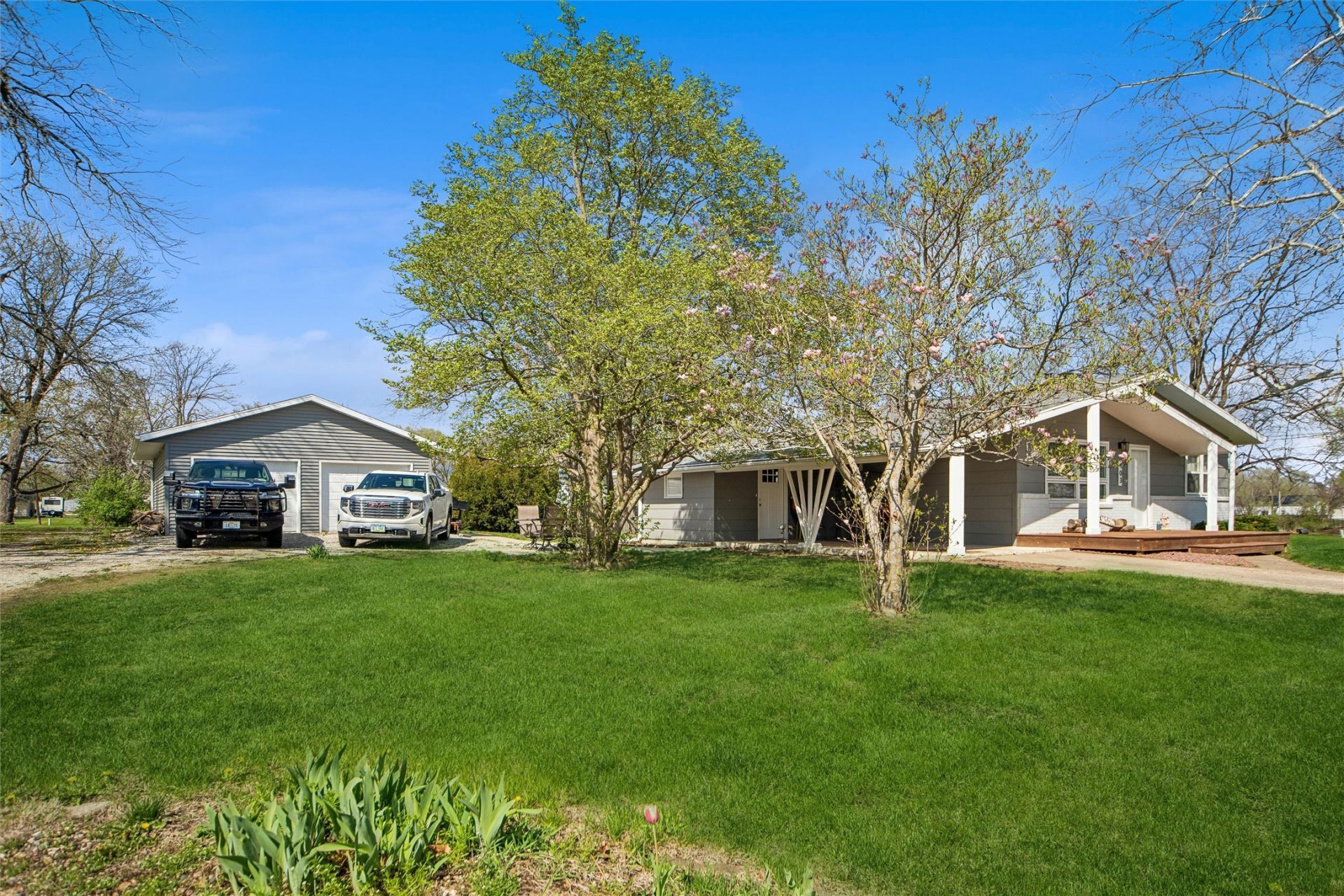 Welcome home to this meticulously maintained small town residence. Featuring three bedrooms and three bathrooms, this ranch-style property was renovated in 2023 to offer a comfortable, modern atmosphere. The main level boasts an open floor plan connecting the spacious living room to the dining area and kitchen, ideal for both cooking and entertaining. Stainless steel kitchen washer and dryer conveniently located in the attached mudroom adjacent to the kitchen. All three generously sized bedrooms and the full bathroom are situated on the opposite side of the home for added privacy. The master bedroom offers a private three-quarter bath and an oversized closet. The lower level includes a partially finished space suitable for a family recreation room, along with an unfinished workroom featuring an additional open three-quarter bath. Outside, the large carport may serve as a covered patio if desired. In 2022, an oversized 24-30 two-car garage was added, complemented by a deck and concrete patio area, providing opportunities for outdoor activities within the 0.36-acre yard.